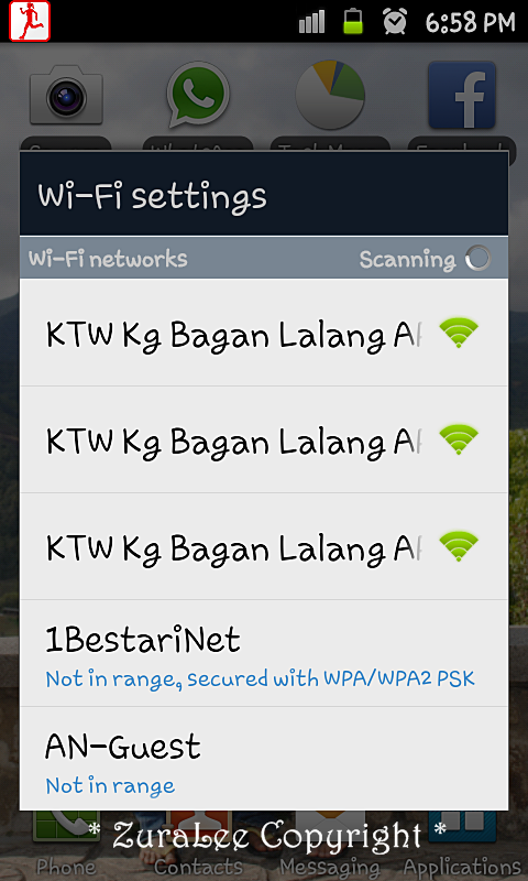 Terus carik signal WiFi, tapi hampeh bile tak boleh connect pulak. Maybe Wireless Access Point dia tak detect henfon orang yang bukan penduduk kat situ.. Hihihih.. Nak on Data Plan 3G takut bateri henfon cepat abih. Masa ni belum dapat power bank free lagi..